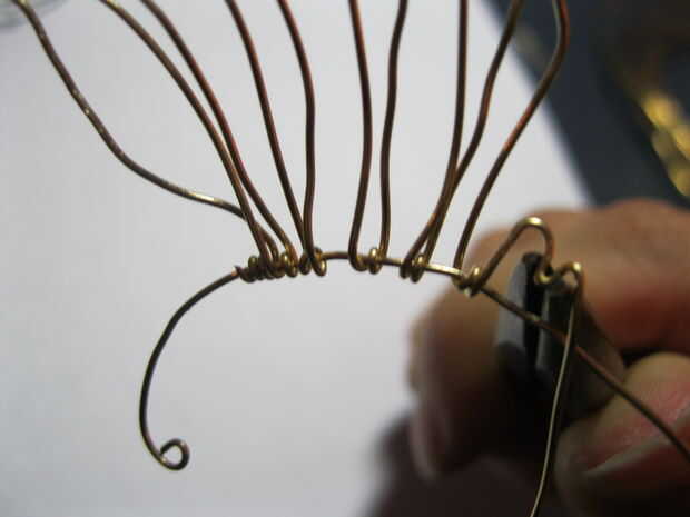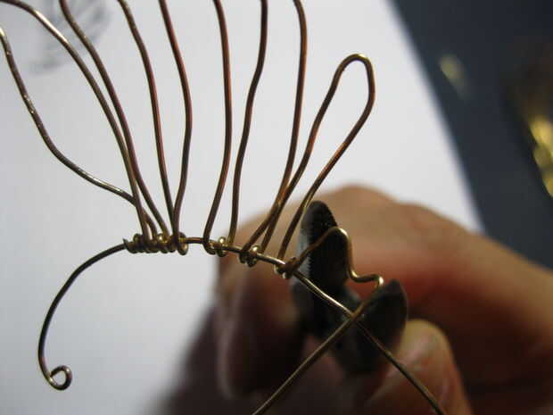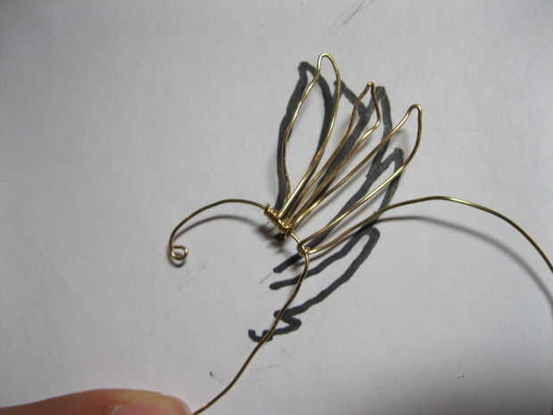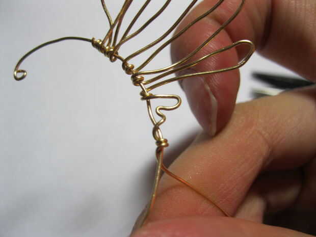 Hacer más plumas de las alas y anclar el cable de trabajo a medida que avanza. Cuando llegar a las plumas de dos bebés, hacer primero una forma M suelta, luego volver y pellizcar el centro de la M para obtener una esquina más definida.