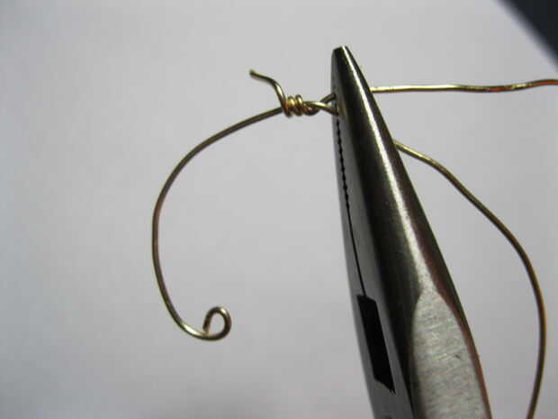 Tome el cable (todavía en el carrete/bobina) y envolver el final cerca de un tercio del camino hacia abajo el alambre del oído. Es más fácil si la curva de la oreja y el extremo largo del cable de la abrazadera con pinzas en una mano y utilice la otra mano para envolver el extremo corto.