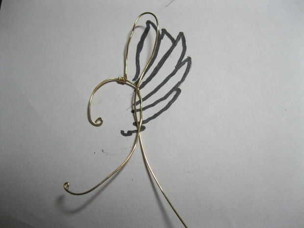 Poner el cable de su oreja hasta su dibujo y doblar la pieza larga a lo largo de la forma de la primera pluma del ala del"". Se dará cuenta de que lo que tienes ahora mismo es un lazo más que una pluma de ala de curvalicious.