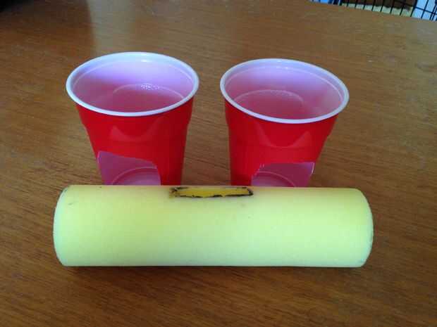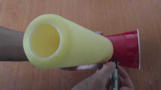 Utilizando la cubierta del rodillo, trazar los orificios en las partes inferiores de ambos vasos de plástico. Corte los orificios con su corte de caja.