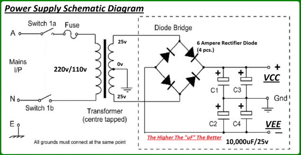 A continuación se muestra el circuito de alimentación, es sencillo también. Hay dos KBU serie (6A) Puente diodos y 2 x 10000 uF condensadores. Como regla general, el condensador de 2200uF estabilización es utilizado por amperio pero estamos acostumbrados a usar 4700uF por amperio. En nuestro circuito, se sorteará 2 amperios por linea y utilizar condensadores de 10000uF. Te recomendamos usar condensadores de 2x10000uF por cada línea si se utiliza el amplificador en modo fiesta.