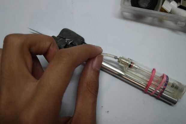 Garantizar el depósito de combustible con una banda elástica para bajar el mango del cuchillo x-acto luego esmalte una cantidad generosa de pegamento entre los dos. (ver imagen 1)