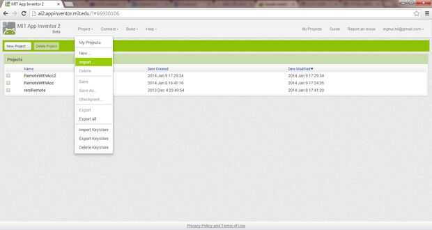 3. Haga clic en proyecto -> importar para importar el proyecto desde el archivo adjunto a continuación (extracto del archivo RemoteWithAcc.zip a RemoteWithAcc.aia antes de la importación)