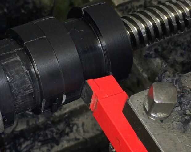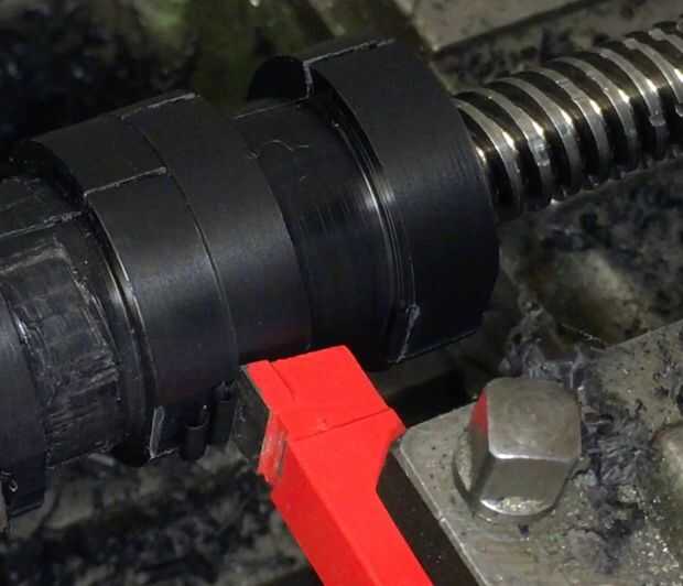 Necesita un lado plano para dejar la tuerca gire. Ya que este es el único plástico que simplemente se puede abordar en el torno. Vuelta de la energía y bloquee el eje. Luego realizar cortes muy finos con una herramienta de corte plano y ancho. Funciona como un encanto.