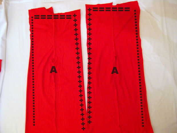 Juntar las 2 piezas de la A, con el lado derecho de la tela uno frente al otro y para que el ===, +++ y... estén alineados entre sí.