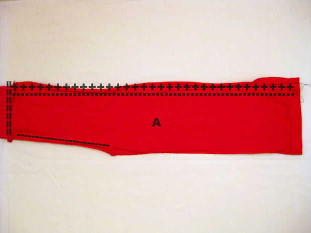 Dobla la pieza a lo largo tal el +++ lado se reúne con el... lateral con el lado derecho de la tela uno frente al otro. La imagen muestra una sola pieza A. El otro es el marco. Las 2 piezas del forman un trozo largo de tela.