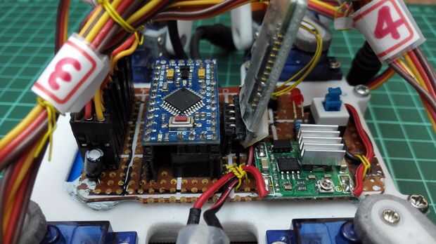 2. los servos consumen mucha energía, casi 3A en condición de plena carga. Utilice más grueso alambre para tierra y "poder" "rastros.