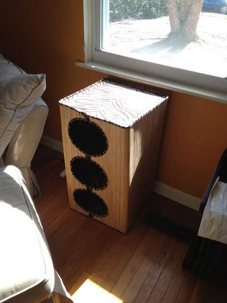 Este árbol del gato consta de un mueble viejo (gratis), un tubo de alfombra (gratis), césped artificial (donado por un amigo) y 3 x 'Sindal' alfombra de Ikea (£3 cada uno).El árbol fue hecho durante un fin de semana y ofrece juegos y diversión sin fi