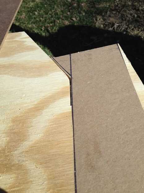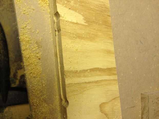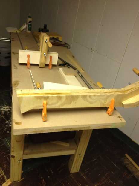 El interior de las esquinas fueron cortadas con una sierra de calar dejando sólo los cortes rectos que se manejaron con la sierra circular y una guía de corte. Esta pieza inicial sirve como patrón para los otros dos. Capas posteriores comienzan como áspero corte los trozos suficientemente grandes como para tornillo pegamento original en con una proyección de alrededor de los bordes. Un poco de rubor fresadora entonces fue utilizado para quitar el exceso de madera.