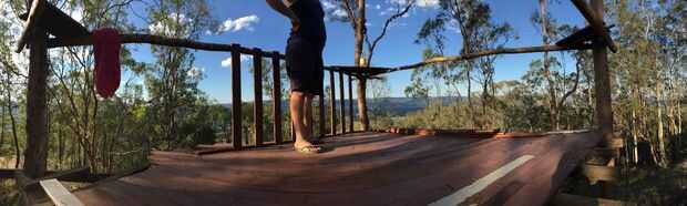 ** durante la compilación que subestimar la flexión que el suelo sólo habría apoyado por esencialmente 6 puntos, sobre un palmo cuadrado de 4,5 m, utilisign fuerza que ni siquiera sabía que tenía, me y cam musculado un árbol ancho de 200 mm del suelo y cavó un hoyo profundo de dos pies directamente debajo de un placa soporte del spannign la parte inferior de los portadores de , una pequeña caja fue fursnihed y atornillado a la placa y la parte superior del tronco del árbol cortado a tamaño y martillos contra él, mientras esto sucedía había tensado la casa del árbol por encima de la muesca del árbol para levantar la plataforma approxmatley una pulgada, lo que nos permite caer esencialmente la plataforma sobre el soporte cuando se libera,