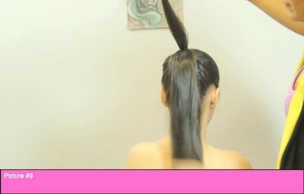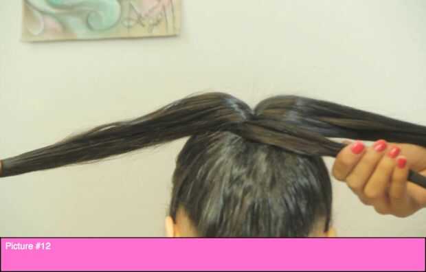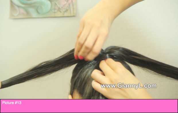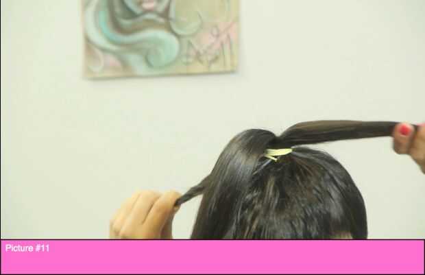 #11 y #12 del cuadro de la imagen: Luego en dos sección incluso separar otra vez el pelo, con la corbata del pedacito alrededor una vez