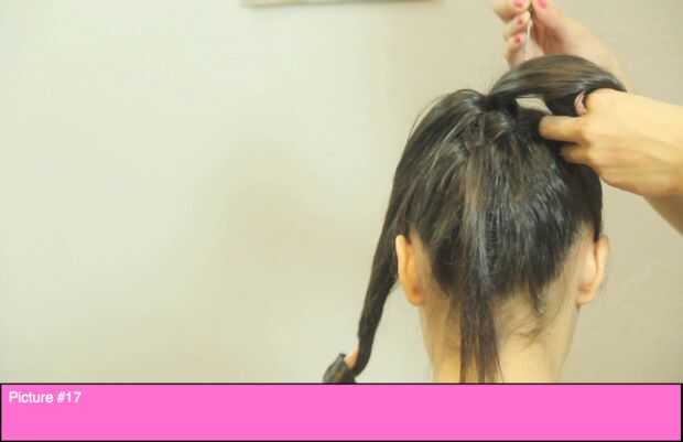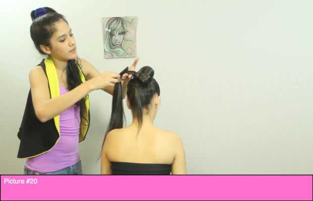 Luego separa en dos secciones iguales el cabello, con la otra parte más pequeña da una vuelta atando alrededor.
