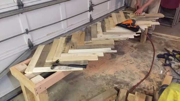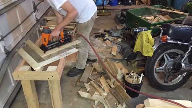 Corte un montón de paletas con mi sierra circular para conseguir un montón de espacios en blanco aproximadamente de 24" de largo. Usted quiere asegurarse de la primera fila de listones comience a exactamente 45 grados y en el centro en el larguero. Si te equivocas esto al principio puede compensarse el patrón para el resto de la banca!