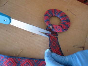 Ahora usted debe cortar cualquier cinta extra.  Recuerde dejar un poco siendo: usted necesitará suficiente para hacer un dobladillo y cubrir la punta expuesta de cartón.