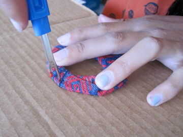 Tomar una herramienta afilada y perforar la sección estrecha del aro de tela.  Puede utilizar cualquier cosa, desde un clavo afilado para herramientas de un dentista; En esta demo estoy usando a algún tipo de herramienta de tapicería que me prestó mi amigo.  Asegúrese de que el agujero que pierce está cerca del borde exterior del aro - desea permitir suficiente espacio para el salto anillo o pendiente gancho pase a través.