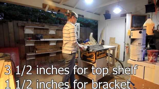 Empecé a medir y cortar la madera de los estantes en mi sierra de mesa y Sierra para cortar ingletes. Usé un 1 x 6 que arrancaron hasta 3 1/2 pulgadas para mi estante superior y el inferior soporte arrancó a 1 1/2 pulgadas. Les corté a 43 pulgadas en la sierra para cortar ingletes. Sin embargo en la tienda de mejoras para el hogar, que usted puede encontrar 1 x 3 y 1 x 2 madera tableros que sería perfecto y entonces no necesita rasgar cualquier madera en todo y se puede utilizar un simple Serrucho para cortar la madera, o usted podría tener hacerlo para usted en la tienda.