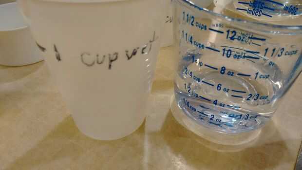 Para hacer el mojado menor taza de medir, hacer lo mismo con los pequeños timbales: llenar, entonces vacía de medio o cuarto taza deseada y marque en consecuencia.