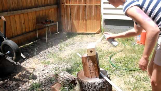 A continuación, corte un bloque de 10 pulgadas de un pedazo de 4 x 4 de madera. Taladré un agujero de 1 1/8", unas 5 pulgadas de profundidad en la parte superior con una pala de bits y corte de 45 grados en el otro extremo.