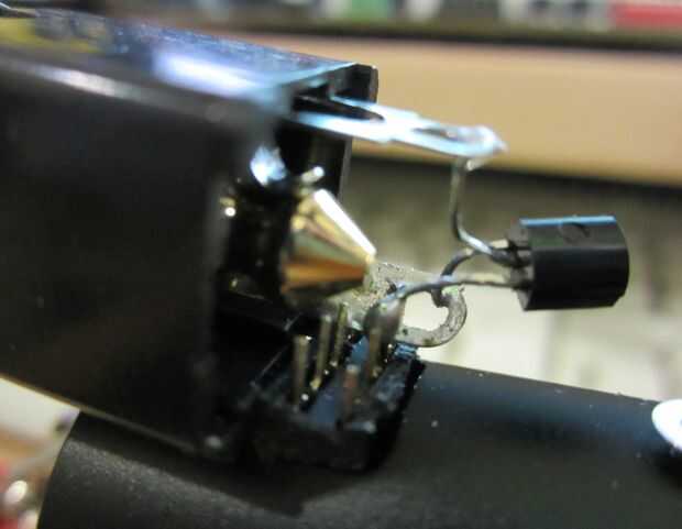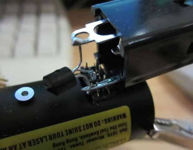 El pin GND de la toma de 1/4" fue soldado al pin izquierdo inferior de la cabecera de 2 x 4. En las fotos, parece que está tocando el eje superior izquierdo, y es, pero esa conexión no es necesaria para el control de audio. Además no daña el láser si el pin GND está tocando el eje superior izquierdo.