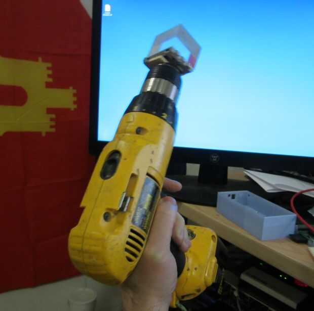 Una vez que había curado del epoxi, nos puso la punta del destornillador en un taladro eléctrico y girar con el láser brilla en él!