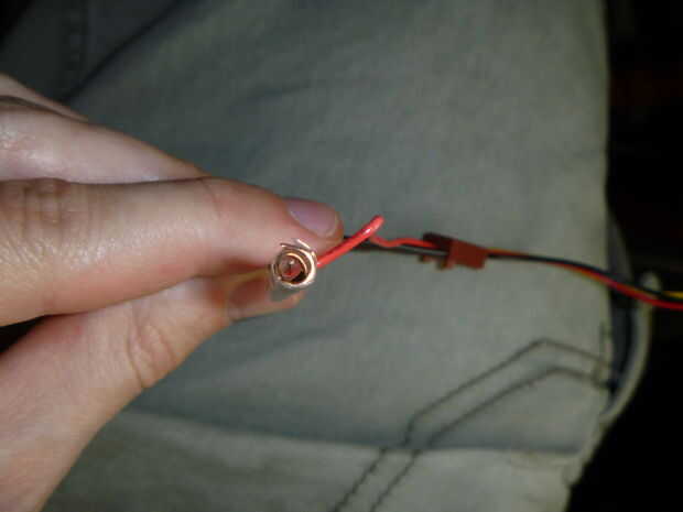 Mi adaptador de corriente tenía un agujero interno muy pequeño por lo que pude para sólo empujar el 22 gage el alambre en el para conseguir buen contacto eléctrico. Si agujero de su adaptador es más grande , a continuación, puede enrollar el cable alrededor de un perno o un clavo de pequeño diámetro para mejor contacto con el interior del orificio del pasador.
