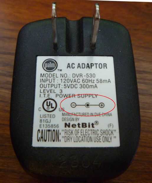 Debe existir un diagrama en el adaptador de alimentación que parece suave del este: (-)--C--(+) significa que ese positivo es en el interior del adaptador y negativo es en el exterior.