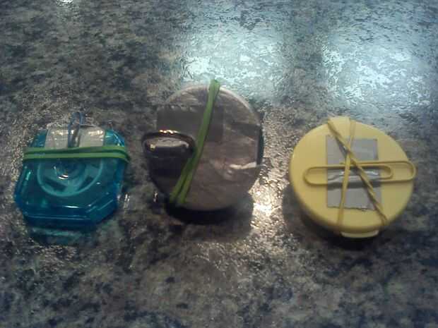 Estos tres ejemplos se hacen de clips de papel, ruedas de coche de madera de pino, un gancho de la correa, cinta métrica, caja de la menta y caso de píldora de viaje.