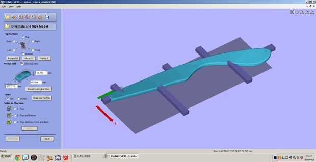 Se realizará la parte frontal de una pieza de Ipè de dimensiones 80 x 180 x 23.3 (z) mm. He añadido las lengüetas en los puntos más frágiles pero también más simple para su eliminación.