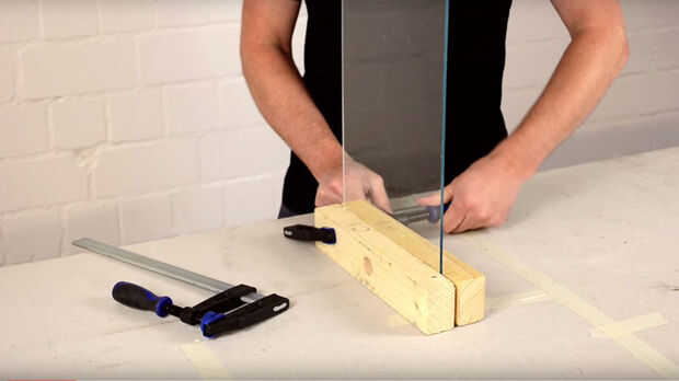 Ahora usted puede comenzar! Poner madera dos cuadrados del mismo tamaño en una superficie plana y coloque el panel de plexiglás vertical entre ellos para que su lado más corto se coloca en la superficie. Con la ayuda de dos pinzas el panel de plexiglás se fijarán suavemente entre las maderas.