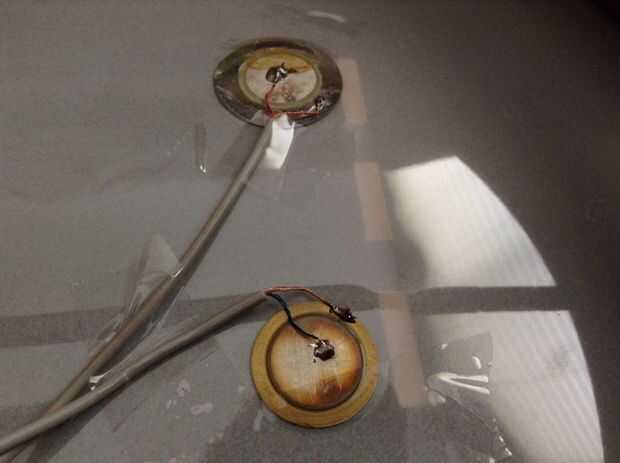 Coloque cada elemento piezoeléctrico en la parte inferior de la caja a cada lado del puente. Utilice cinta adhesiva para fijar cada elemento piezoeléctrico. Pegue el cable al lado del banjo para evitar que los elementos piezoeléctricos están arrancadas.