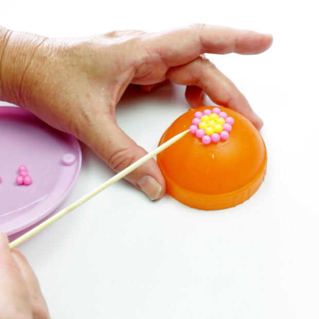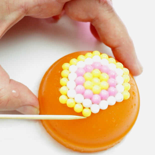 • Agregar el segundo color y colocarlo en el exterior de los granos amarillos. Rociará más agua en los granos para que se peguen juntos.