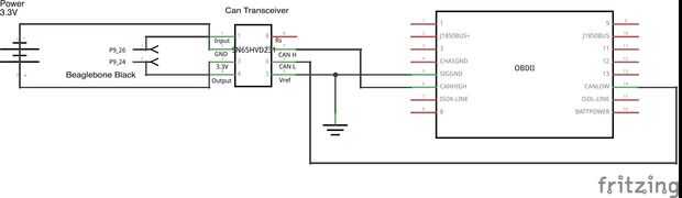 La tercera foto muestra un esquema de la disposición entera que es bastante simple por lo que no escribe todo aquí. Básicamente se montan las líneas Beaglebone RX/TX para el equipo de TI puede, y desde allí salir del autobús del vehículo, que se encuentra generalmente en los pines 6 y 14 del puerto OBD-II, situado en algún lugar debajo del rociada/volante del lado del conductor. Si tienes problemas para encontrarlo, trate una búsqueda rápida de google, algunos se ocultan detrás de las aletas o los paneles.