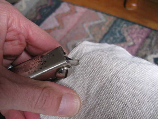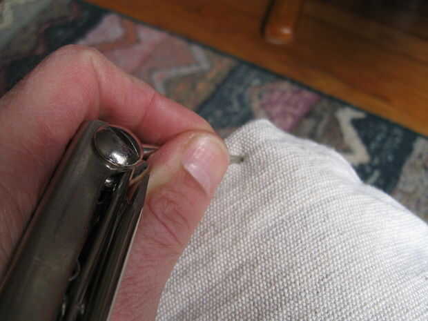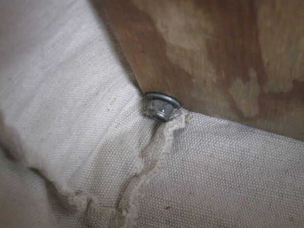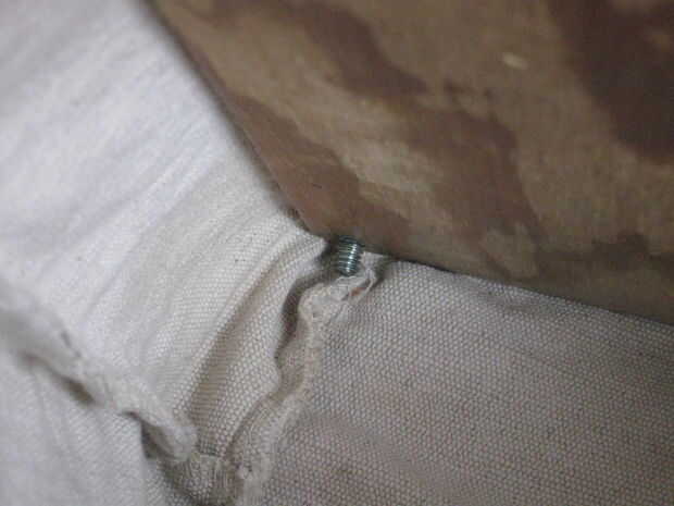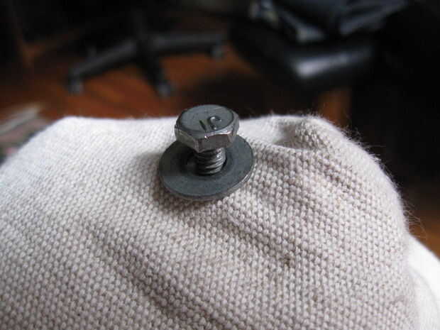 3. el trabajo uno de los tornillos en el agujero desde el exterior de la bolsa, con una sola arandela en el perno (la lavadora aquí es importante porque ayuda a proteger al tejido de la bolsa de desgaste). Es un poco complicado conseguir los hilos de rosca comenzadas, pero una vez que el agujero lo suficientemente ancho, puede atornillar el tornillo a través de la tela.