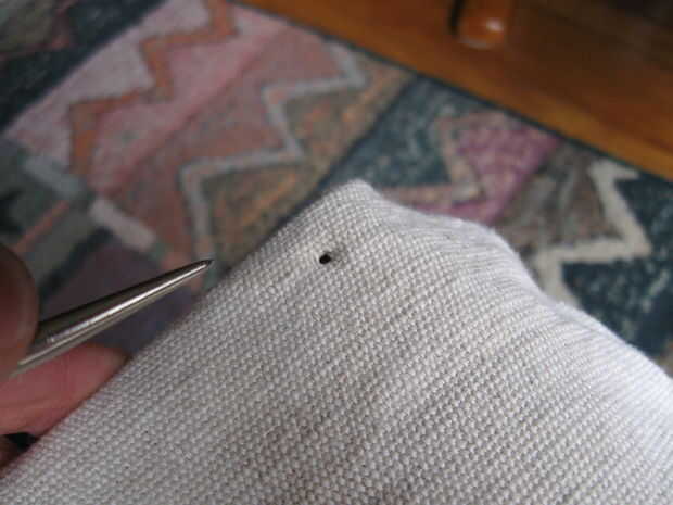 1. Inserte la Junta en la bolsa y encontrar lo que será su posición final en una de la parte inferior en las esquinas interiores. En esta posición, la esquina de la Junta debería caber estrechamente en una esquina inferior de la bolsa. Celebración de la Junta y la bolsa, con la tela estirada, tomar un punzón hace un agujero en el lienzo.