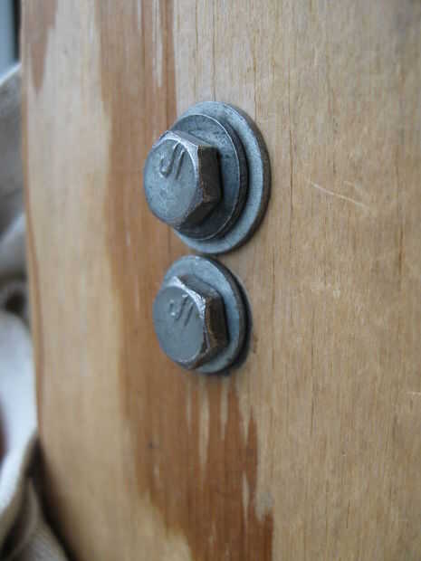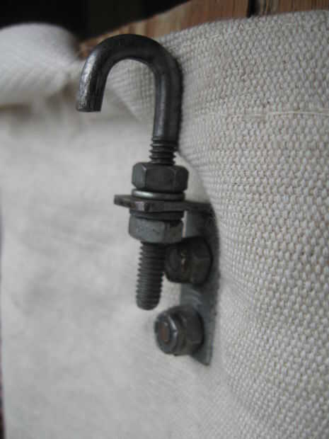2. Inserte el perno desde el interior de la bolsa, pasando a través de la junta antes de entrar en la tela. Tenga en cuenta que el perno superior utiliza dos arandelas, mientras que la parte inferior sólo necesita uno. Esto es para mantener el tornillo de interferencia con una de las tuercas que sujeta el gancho en el soporte.