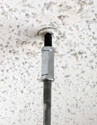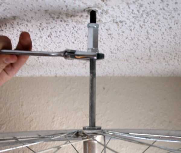 Una vez que el perno de carruaje ha sido atornillado en la tuerca de acoplamiento, apriete la contratuerca segundo contra la tuerca de acoplamiento. Ver foto 2 para un primer plano de cómo debería verse este paso una vez terminado. Ahora debería tener un robusto, girando la rueda de bicicleta colgado de tu techo!