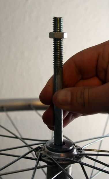 En el siguiente paso, se fije la rueda en el techo, girando el perno de carruaje en la tuerca de acoplamiento y, a continuación, apriete la contratuerca a rosca en el tornillo de carro contra la tuerca de acoplamiento.