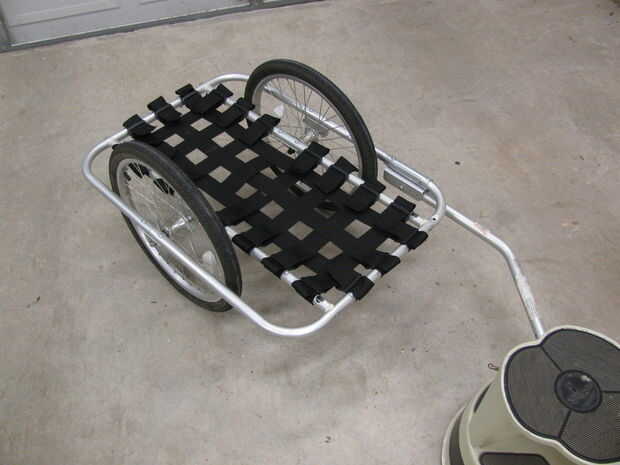 aquí es mi moto favorita de carga actual y remolque de bicicleta.El carro tiene bujes de silla de ruedas con llantas y neumáticos de una bicicleta de montaña.El bastidor del carro es azotado junto de otros palos y palos de hockey.Es fuerte y fácil de