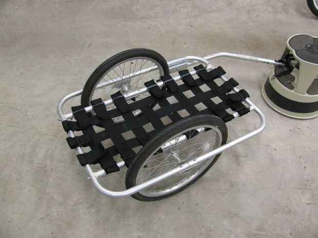 Fotos del trailer completo. Con tela metálica y ruedas, pesa adentro en # 15. 1-1 / 2# más pesado que un trailer Bob Yak. Y, la cinta puede ser aflojada permitiendo que la red al sag (creación de un centro de gravedad más bajo).