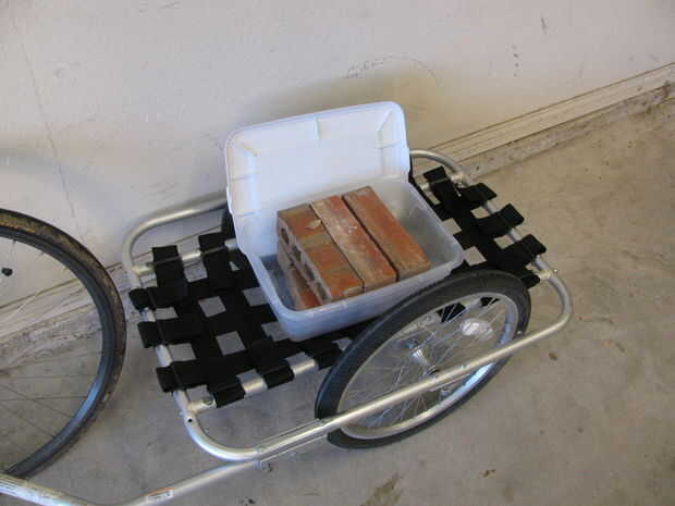 Adjunto el trailer a mi bici y me cargué 24# de ladrillos para la prueba de conducción. Aaaand, que vamos!