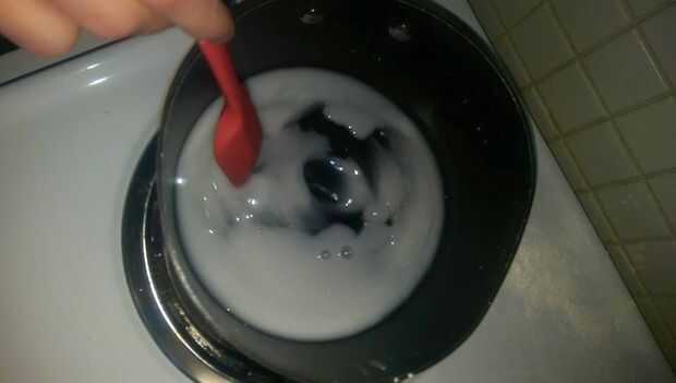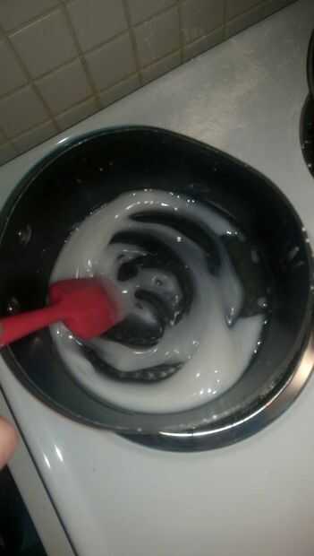 Después de que el calor está encendido, la mezcla debe removerse regularmente para evitar agrupar. Será un color lechoso al principio, pero será pronto Haz más grueso y gire a la ligeramente translúcido. Es importante mantener el calor bajo para que el calor se distribuye igualmente a través de. Este proceso ocurre rápidamente (las fotos de arriba fueron tomadas ~ 30 segundos de diferencia), por lo que seguir revolviendo hasta que la mezcla espese.