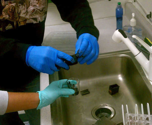 Una vez abierto el cartucho, a ver que el depósito de tinta todo es tomado por una pequeña esponja que mantiene la tinta en su lugar. Cartuchos de color tienen compartimientos de tinta separados con sus propias esponjas (típicamente Cyan-Magenta-amarillo, no rojo, verde y azul, ya que la impresión de colores sobre papel blanco, es un proceso sustractivo del color). Puede exprimir cualquier tinta restante y mantener para experimentos posteriores (por ejemplo para algunos cromatografía de papel). A continuación, enjuague, enjuague y enjuague con agua destilada o desionizada más-no queremos obstruir el cabezal de impresión con residuo mineral. Queremos salir toda la tinta, por lo que no interfiere con nuestros experimentos.