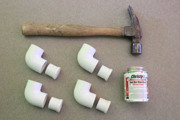 Después de los tapones en su lugar, inserta las piezas de PVC de 4-6" en los extremos abiertos de los codos de 90 grados y asegura utilizando un martillo.