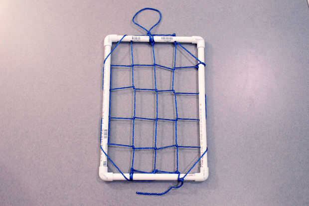 Una vez que la estructura se ensambla puede marcar la ubicación de los orificios que servirán para tejer la cuerda a través de crear el centro de la red. Crea una cuadrícula de 4 x 5 y marcados los agujeros hacia fuera cada 3".
