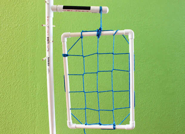 Para rematar la plataforma que desea a tejer la cuerda por los agujeros para crear un centro de red. Hemos utilizado una pieza continua de cuerda para crear la red, pero esto puede tejer en cualquier diseño que te gusta. También crea un lazo en la parte superior luego había colgado swing neto de uno de los brazos de la percha.
