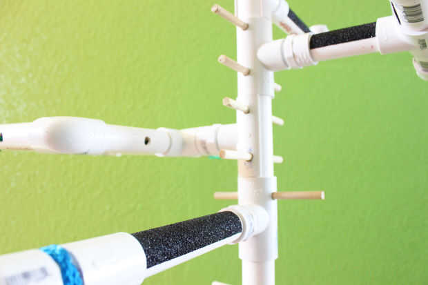 A continuación nos taladrase a 9 hoyos en el poste principal del centro donde nos podríamos introducir los tacos. Mantenerse girando la posición de los agujeros para crear una espiral y luego inserta las clavijas.