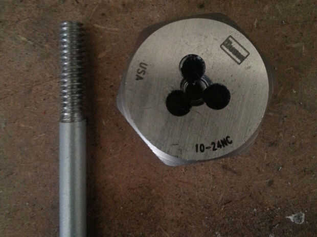 Lo que hice fue medir el grosor de mis estanterías y luego añadir la altura de cada hardware que en cada parte. Por ejemplo si tienes una 1/2" pieza de madera + la altura de 2 arandelas y 2 tuercas (utiliza la altura de la tuerca de seguridad para él y la tuerca de la bellota). Mi total fue de poco más de una pulgada, así que roscados a cada lado de la ' U por consiguiente usando el dado y un poco de aceite de corte (no requerido, pero recomendado). No se olvide de hilo hacia adelante luego hacia atrás y luego adelante volver en lugar de forzar continuamente la matriz.