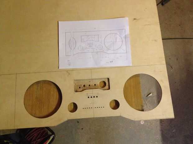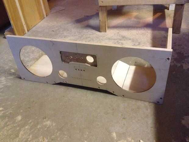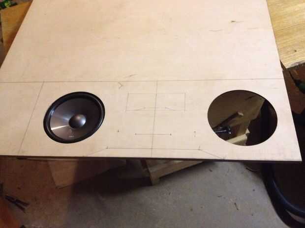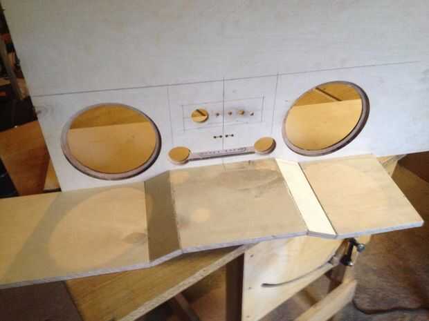 Comenzó trazando las primeras líneas y hacer los cortes más importantes - los agujeros del altavoz. Utiliza un router y una plantilla de corte del círculo personalizado para él. Otro reto fue conseguir las piezas de abajo para caber. Después de calcular hacia fuera el ángulo necesario de las piezas, puse mi sierra de mesa y los cortes. Casi perfecto. Nada no puede fijar el relleno de madera. Que cortar todas las piezas comenzaron a montarlos con tornillos para empezar por lo que puedo hacer correcciones si es necesario. Siempre Perfore orificios piloto para ambos las piezas que desea adjuntar. También perforé los tornillos 2-3 mm en la madera contrachapada para poder tapar los agujeros luego y obtener una superficie lisa. En cuanto a la cavidad de consola de centro donde van las perillas, hice una plantilla y utilizar el router para hacerse. Los orificios más pequeños fueron cortados a mano. Lo mismo ocurre con los agujeros del altavoz de agudos.