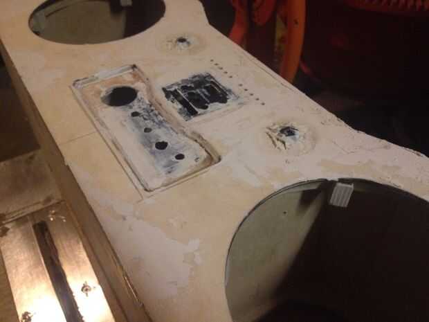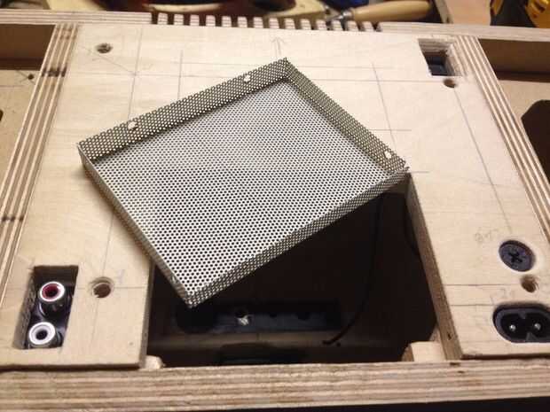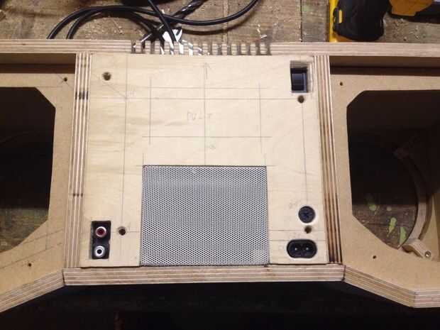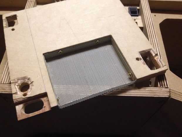 En cuanto a la placa media quería que tienen una entrada de aire en la parte inferior, por lo que encontré cierto acoplamiento de altavoces viejos y corte y había doblado en tamaño. Atado con algunos tornillos y tengo que decir, se ve fantástico. Mientras tanto yo había conseguido eff los agujeros del altavoz de agudos... Me imaginaba un chaflán de 2 mm en los bordes pero corte que con un poco de 45 chaflán grande no salió tan bien... pasó un tiempo de grandes los agujeros de fijación...