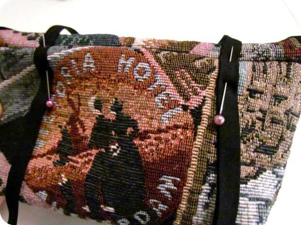 Ahora este paso probablemente debería haber sido hecho primero, pero yo no estaba exactamente seguro de la colocación así que salí a la última.  Cortar dos tiras de cinta de aproximadamente 14-15"(35cm) largo.  Doblar la cinta por la mitad y la tachuela en la parte posterior de la bolsa en la parte superior.  Esto es lo que usaremos para sujetar la bolsa a sus barras de la manija